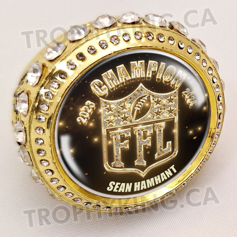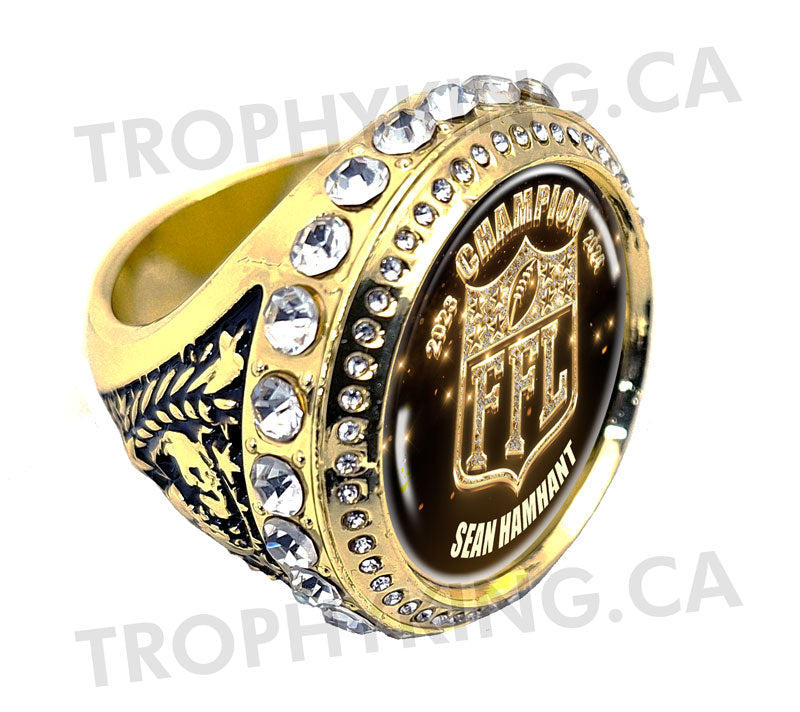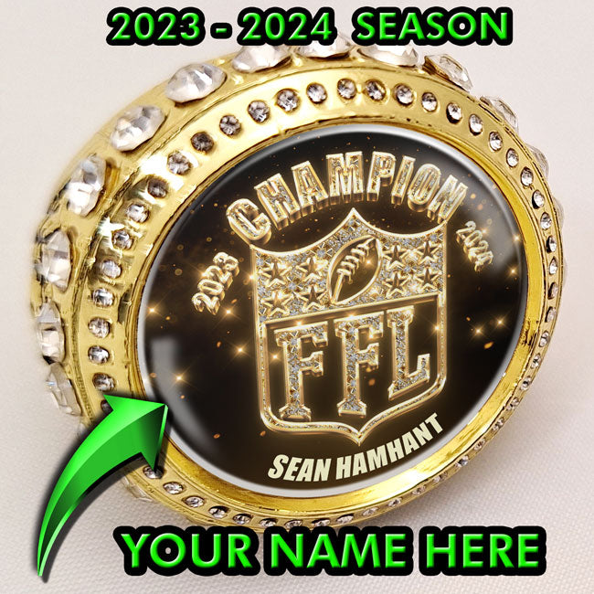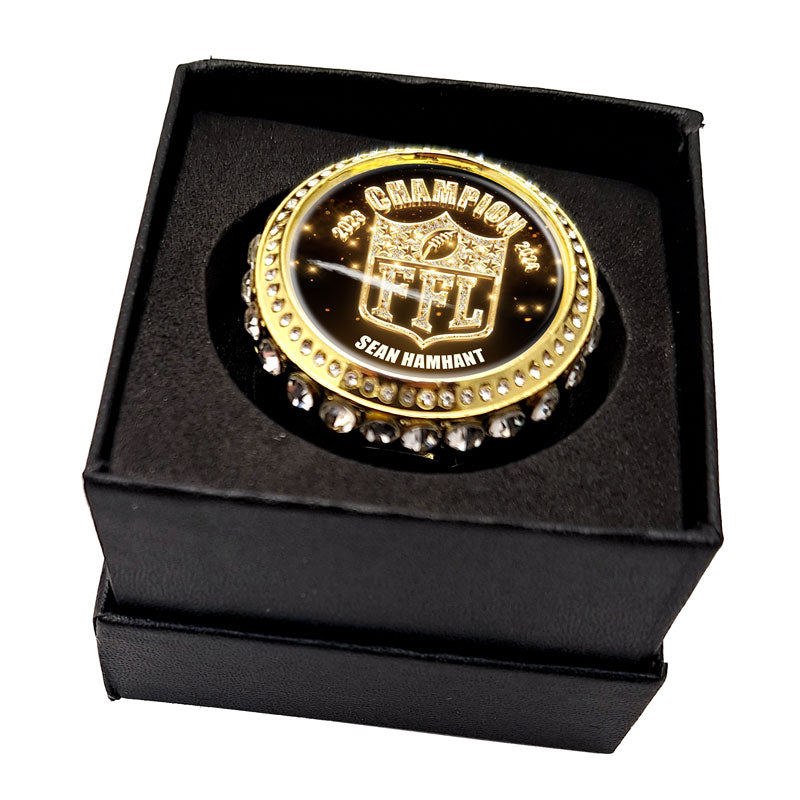 We are calling all champs! It's time to make a statement, a real personal statement. The Power Rings by FantasyToilet.com are not only big, heavy, and bulky, they're beautiful. Each ring is adorned by clear gemstones making you even more prominent. Available in bright gold. Each ring includes a bedazzled FFL graphic and year. Includes your name and or league name.