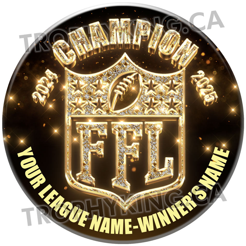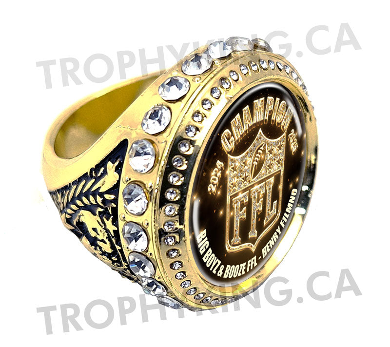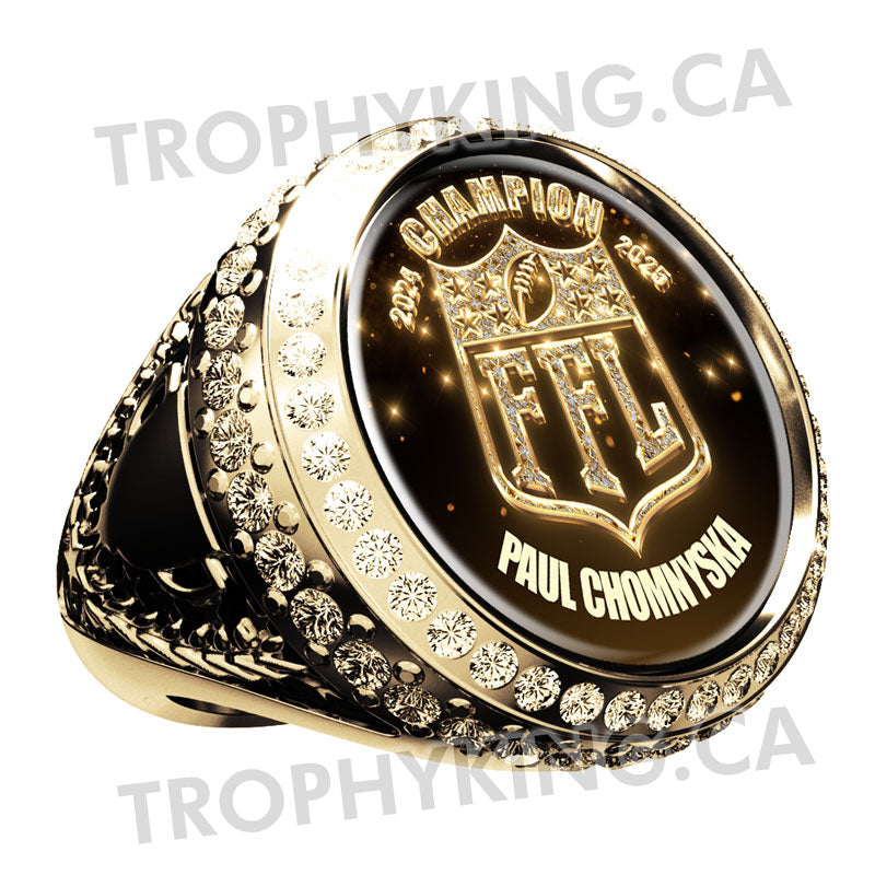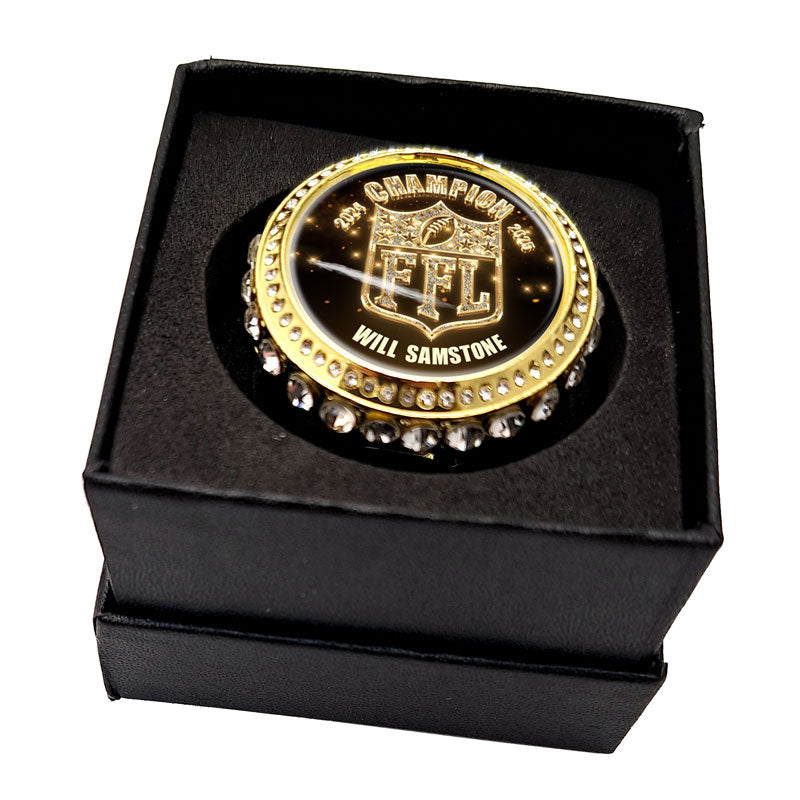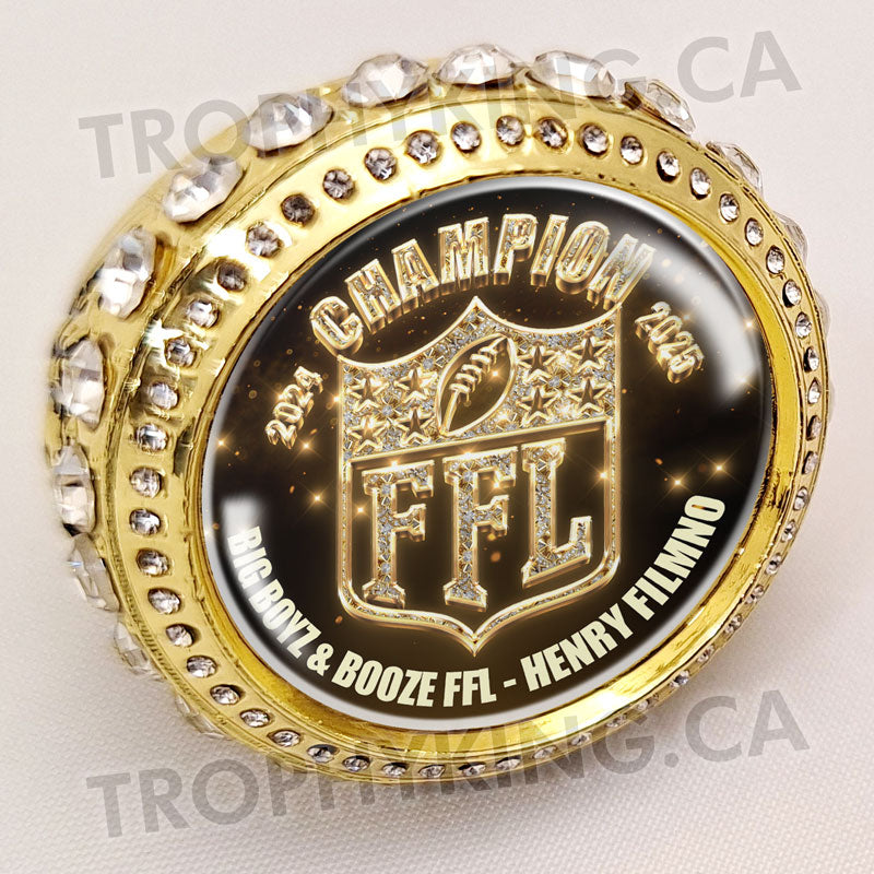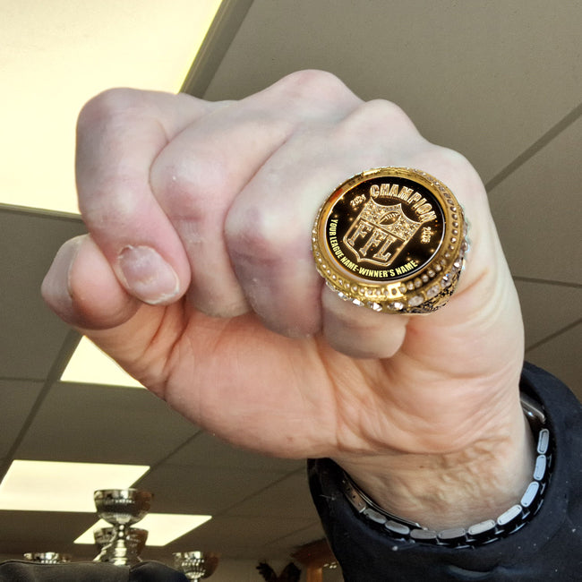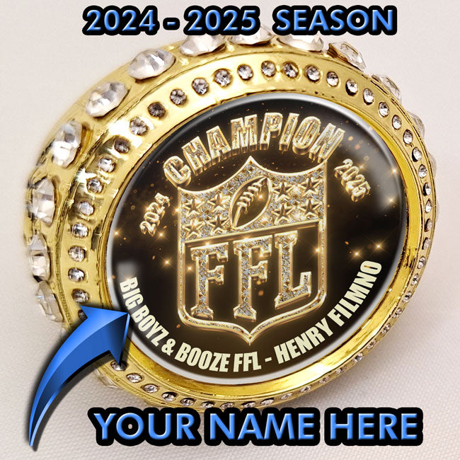 We are calling all champs!  It's time to make a statement, a real personal statement.  The Power Rings by FantasyToilet.com are not only big, heavy, and bulky, they're beautiful.  Each ring is adorned by clear gemstones making you even more prominent. Available in bright gold.  Each ring includes a bedazzled FFL graphic and year.   Includes your name and or league name.