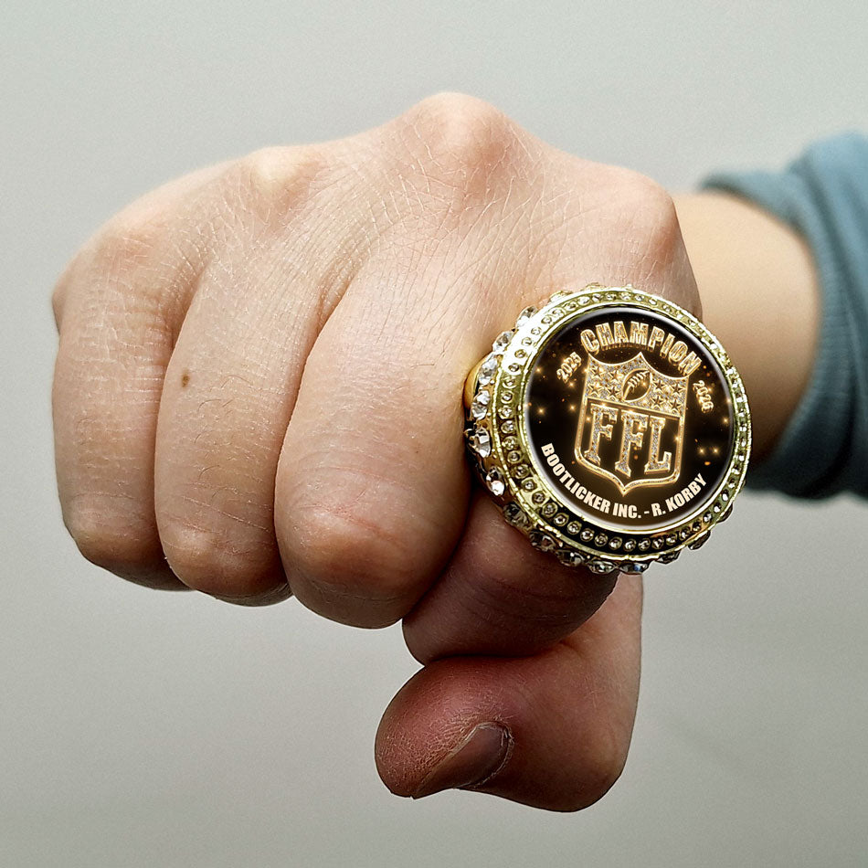 We are calling all champs!  It's time to make a statement, a real personal statement.  The Power Rings by FantasyToilet.com are not only big, heavy, and bulky, they're beautiful.  Each ring is adorned by clear gemstones making you even more prominent. Available in bright gold.  Each ring includes a bedazzled FFL graphic and year.   Includes your name and or league name.